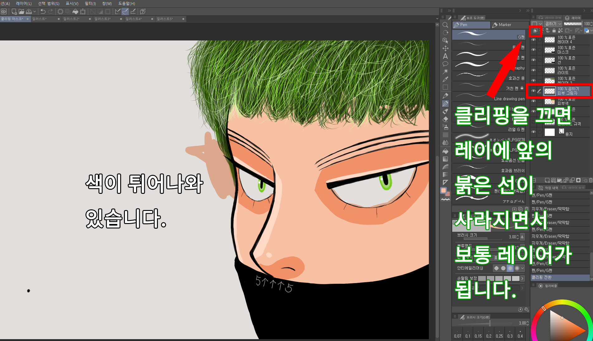 클리핑 아이콘을 다시 한번 누르면 클리핑이 해제되면서, 보통 레이어로 돌아갑니다. 레이어 앞의 붉은 선이 사라졌습니다. 그리고 그림자 넣은 곳이 밑의 피부색을 넘어서 옆으로 튀어나가 있습니다.