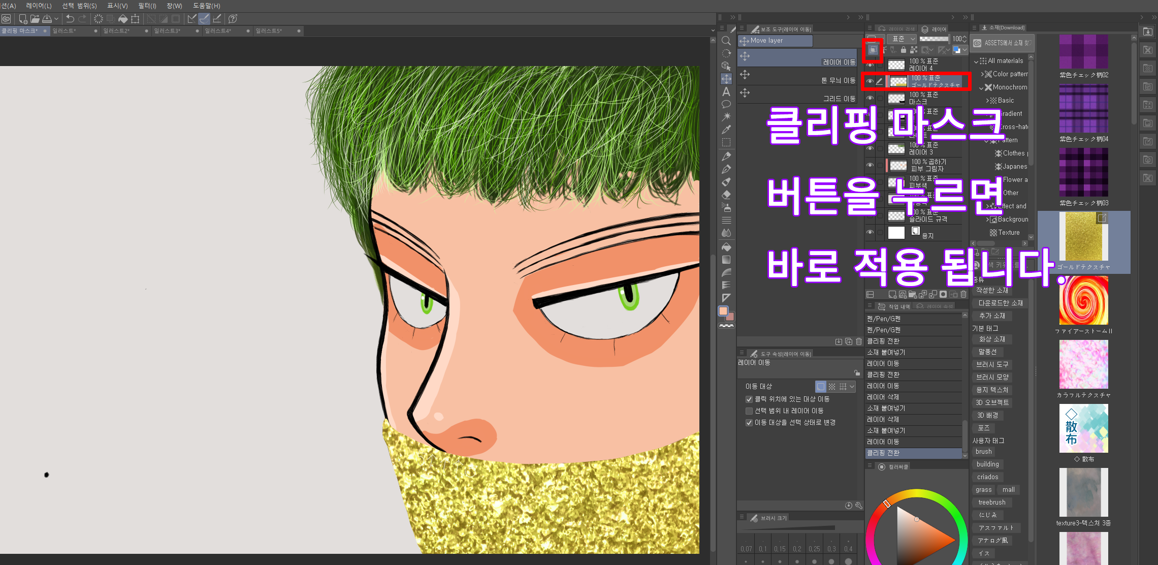 클리핑 마스크는 색이 삐져나가지 않게, 그림자를 표현할 때나 지정한 곳의 질감을 바꿀 때 많이 쓰이며 여러 가지로 다른 곳에 응용할 수 있는 유용한 기능입니다.