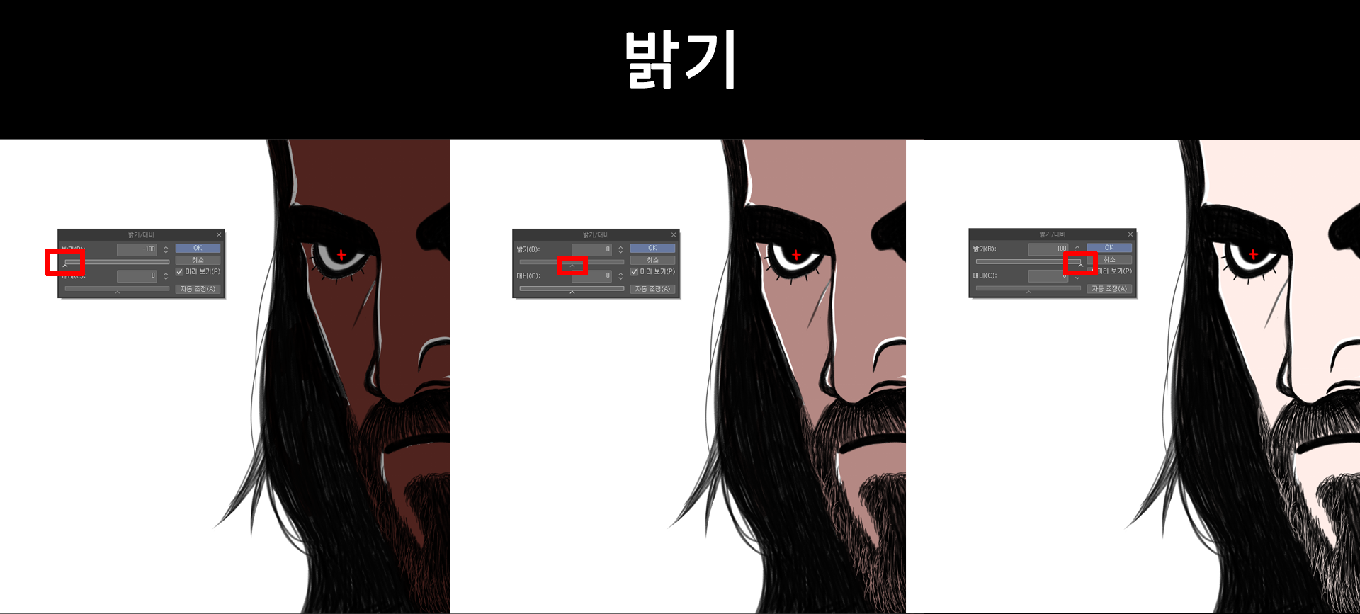조절 창의 밝기 값과 대비 값을 조절하여 색을 조정하는 기능입니다. 밝기는 기본적으로 왼쪽으로 갈수록 어두워지고 오른쪽으로 갈수록 밝아집니다. 그리고 아래의 대비 값과 조합하면 아래 그림과 같이 여러 가지 색상으로 변환됩니다.