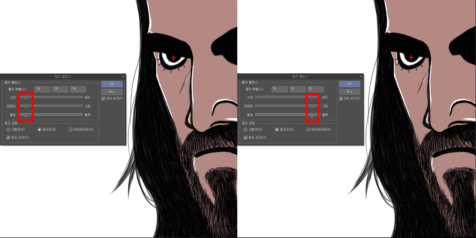 컬러 밸런스 창을 열면 오른쪽으로 레드, 그린, 블루(RGB)가 보이고, 왼쪽으로 시안(밝은 파란색), 마젠타(밝은 자주색), 옐로(노랑)(CMYK)의 컬러 슬라이드 바들이 보입니다. 이 슬라이드 바들을 조절해서 원하는 색을 만들면 됩니다. 참고로 비율이 같으면 슬라이더의 화살표가 어느 쪽에 있던지 아래와 같이 색은 변하지 않습니다.