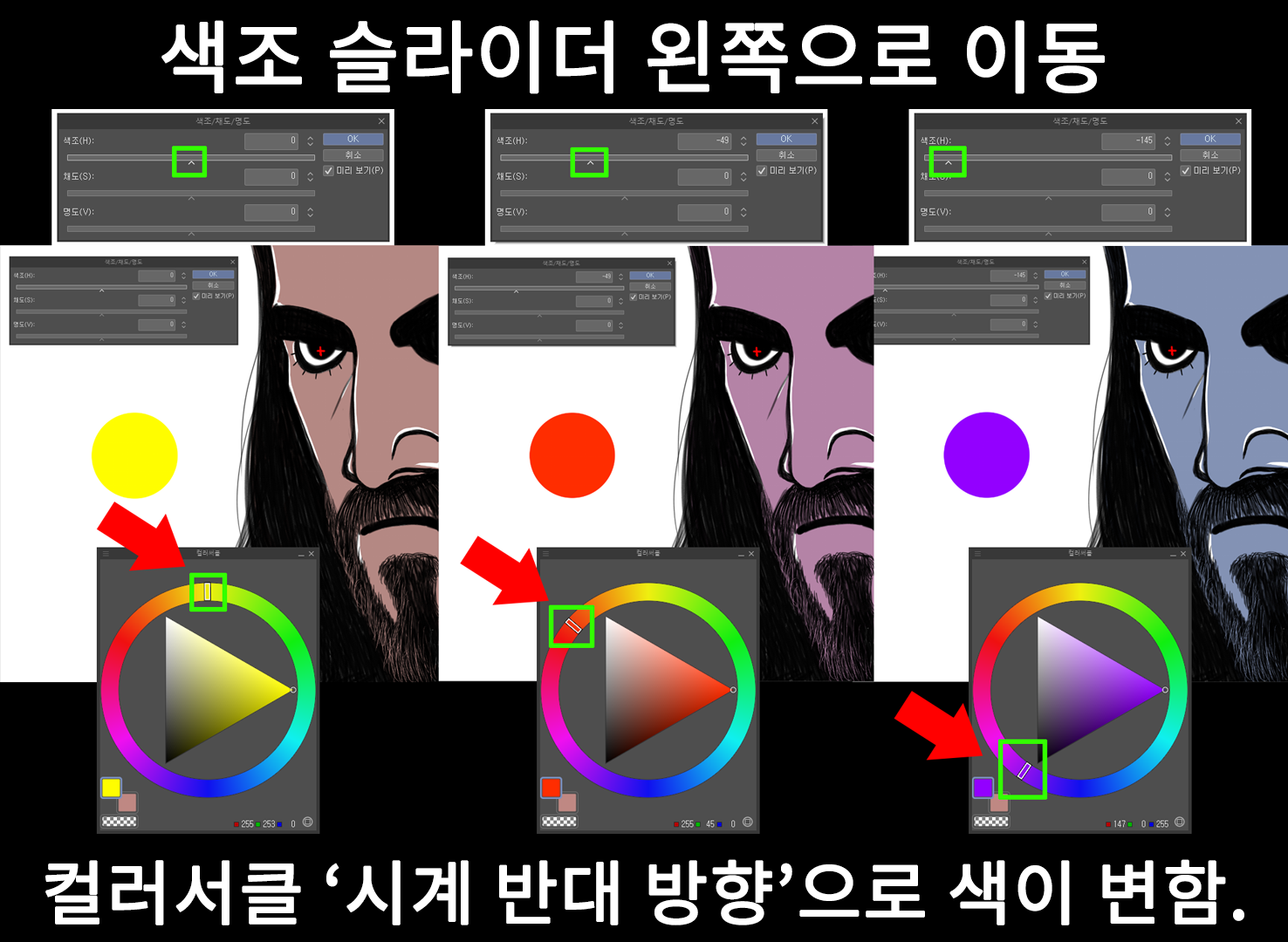 색조 슬라이더 화살표를 왼쪽으로 이동시키면, 아래 그림과 같이 컬러서클의 왼쪽으로 돌면서 색이 바뀝니다.