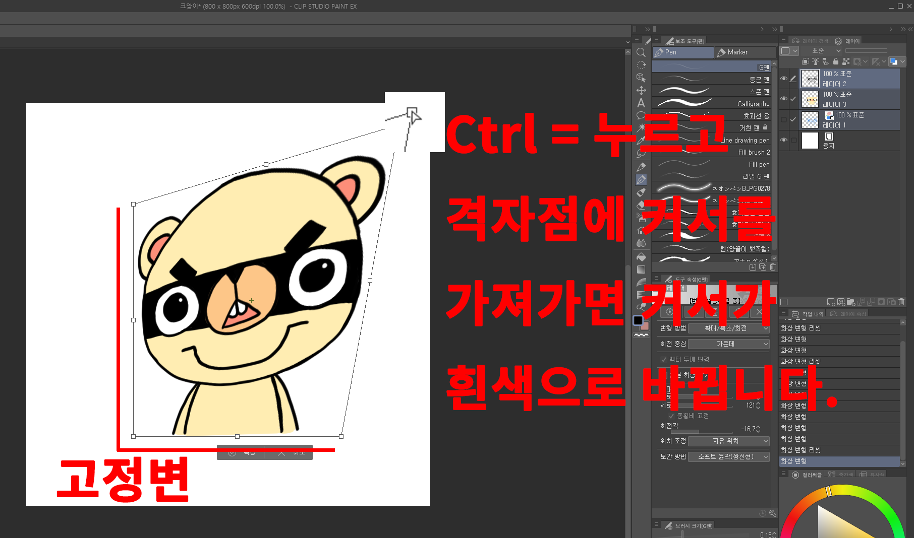각 꼭짓점의 격자점들은, 선택 점의 맞은편의 한 개의 점이 고정된 채로, 가로, 세로 자유자재로 늘리고 줄일 수 있습니다. 마찬가지로 Shift를 누른 채로 변형하면, 원본 비율을 유지한 채로 변형이 됩니다. 그리고 Ctrl을 누른 채로 격자점 위에 커서를 올리면 커서가 '흰색 화살표'로 바뀌면서, 자유 변형 모드로 바뀝니다. (맞은편의 직각 변이 고정된 채로, 남은 두 변과 선택한 꼭짓점이 움직이면서 변형이 됩니다.)