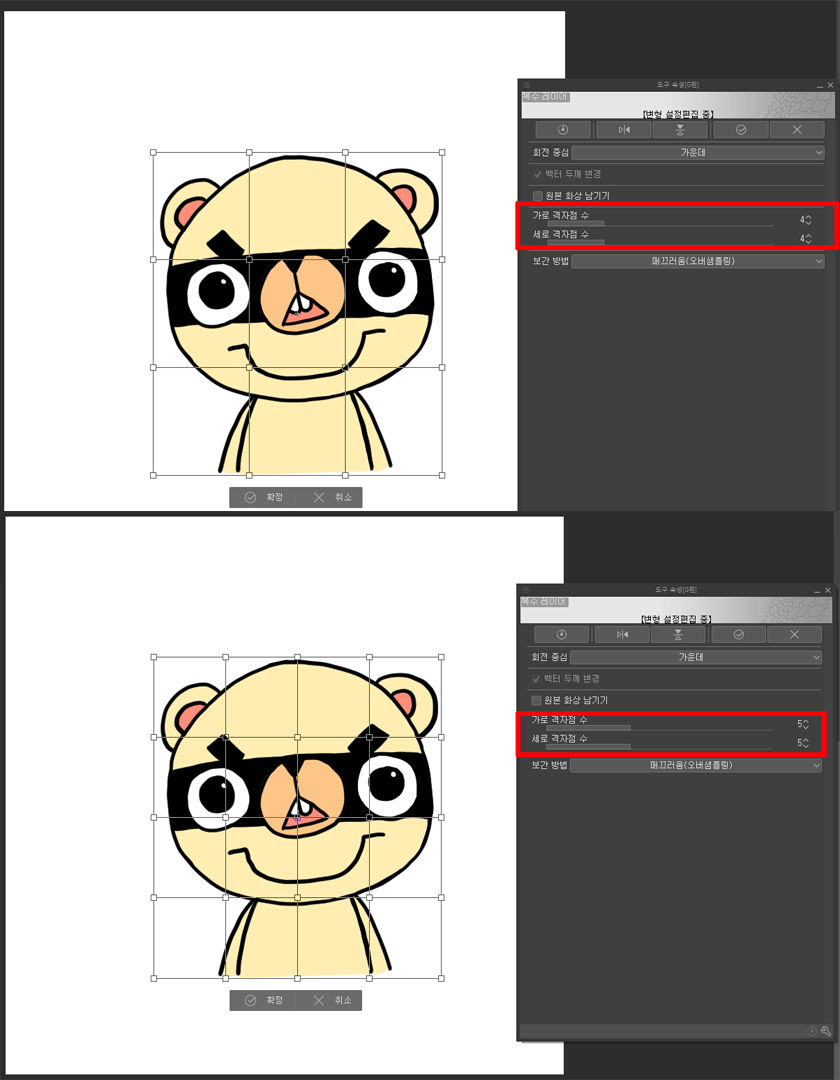 메쉬 변형은 여러 개의 그물망 같은 격자 틀을 이용해서 이미지를 변형합니다. 도구 속성에서 격자점의 개수를 설정할 수 있습니다. 격자점은 최대 10개까지 설정할 수 있습니다.