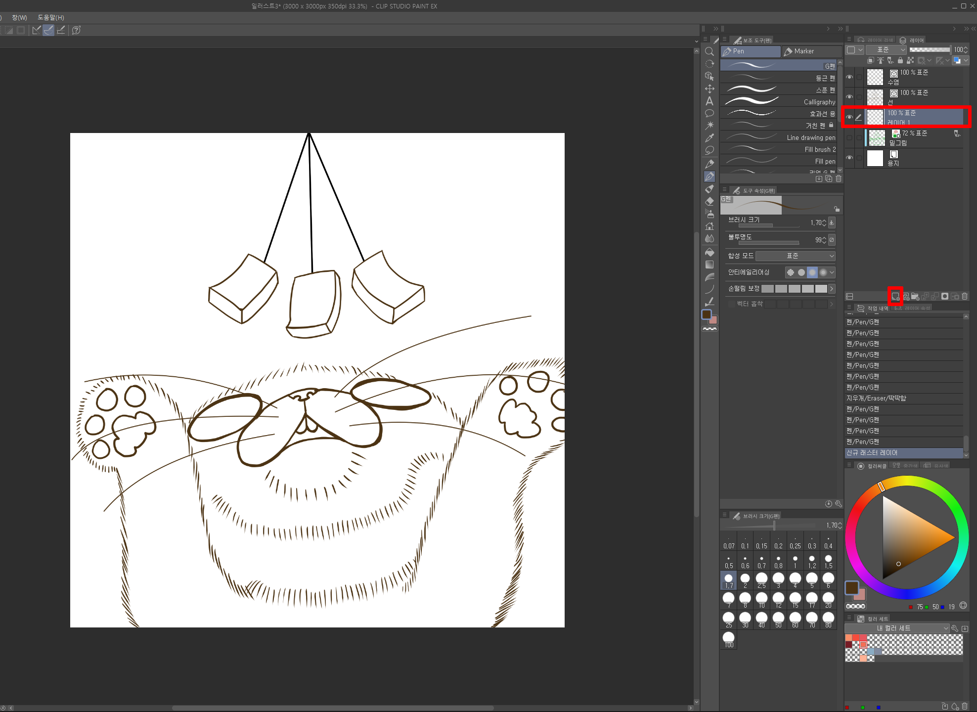 펜 선을 따줍니다.(G 펜 1.7) 그리고 고양이의 수염은 추가 벡터 레이어를 만들고 [도형 툴의 곡선]을 사용해서 그려주었습니다.