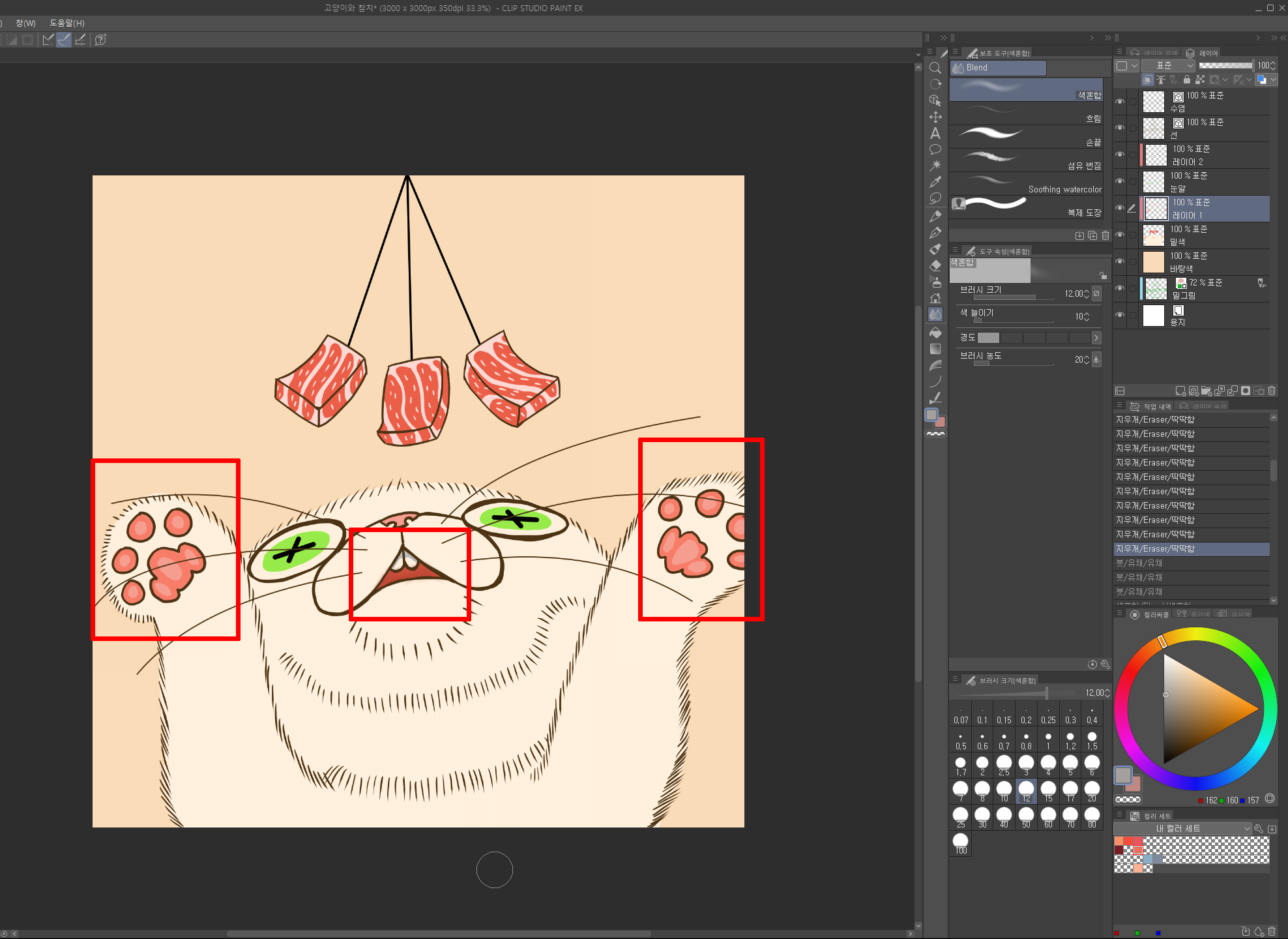 브러시 툴로 고양이 털 색 보다 조금 어두운색으로 그림자도 넣어주고, [색 혼합 툴의_흐림 툴]을 사용해서 경계선을 부드럽게 펴줍니다.