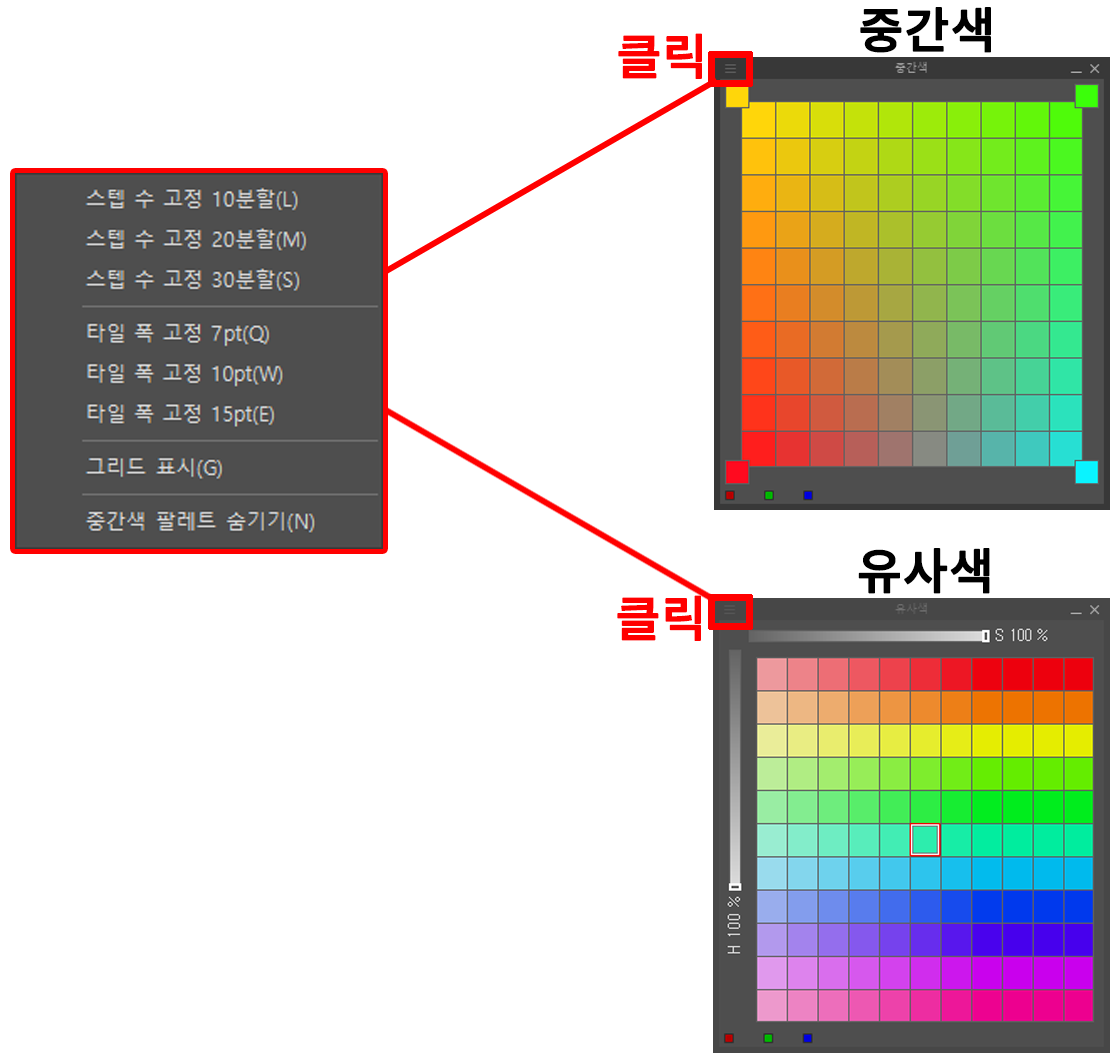 [중간색, 유사색] 팔레트의 왼쪽 위 부분의 삼선 아이콘을 누르면, 여러 가지로 팔레트의 배열을 설정할 수 있습니다.