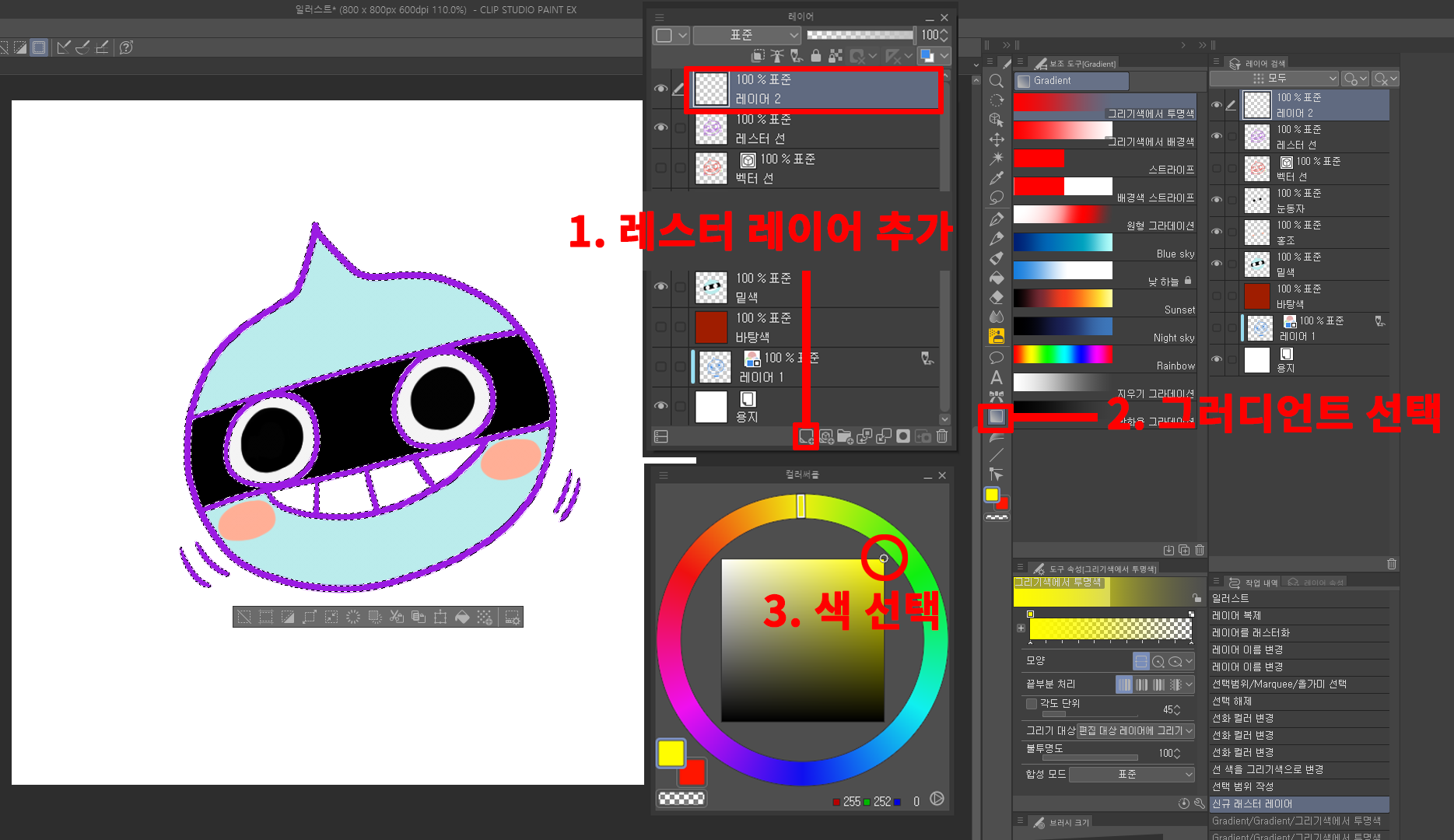 래스터 레이어를 하나 추가하고 그러데이션 툴을 선택한 후 컬러 서클에서 원하는 색을 선택합니다.
