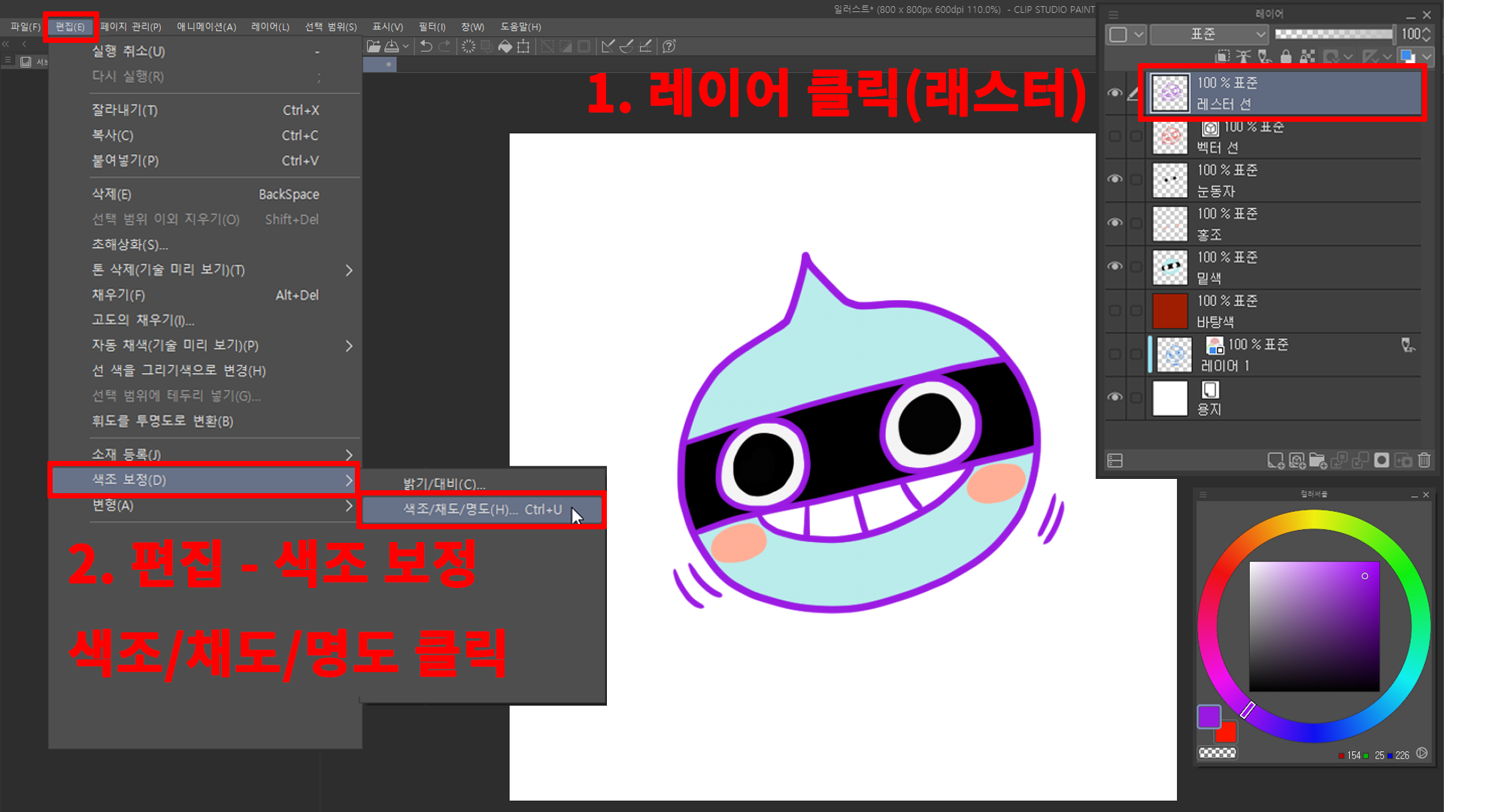 2. 색조 보정으로 선 색 바꾸기: 선이 그려진 래스터 레이어를 선택한 후 [편집] - [색조 보정] - [색조/채도/명도]를 선택하고 색의 변화를 보면서 선의 색을 바꿔줍니다.