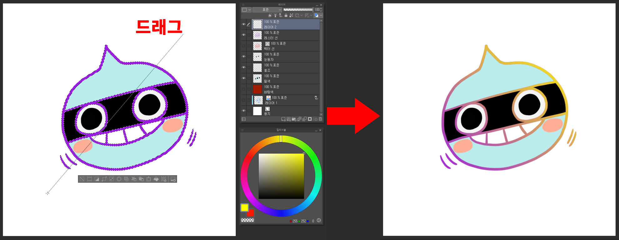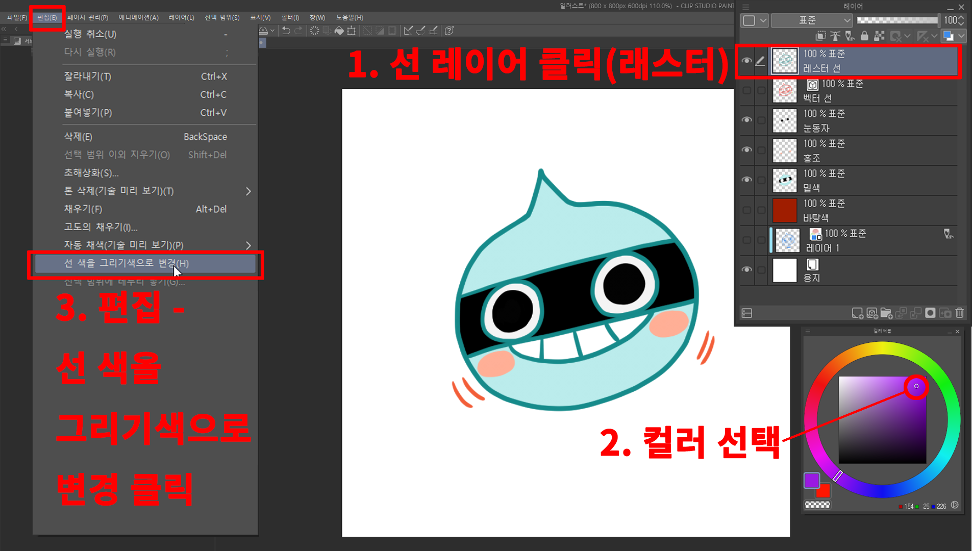 1. 선 색을 그리기 색으로 바꾸기: 선을 그린 래스터 레이어를 선택한 후 컬러 서클에서 변경하고 싶은 색을 선택하고, [편집] - [선 색을 그리기 색으로 변경]을 선택하면, 아래와 같이 선 색이 변경됩니다. 정말 간단합니다.^^
