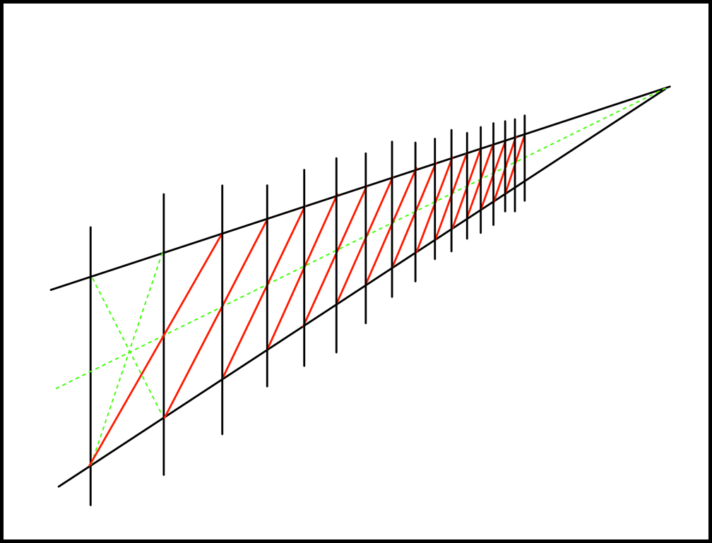 첫 번째 사각의 간격을 기준으로 해서, 사각의 중심점을 찾고 소실점과 연결되는 선을 그려줍니다.