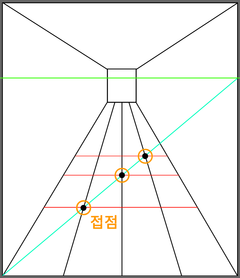 눈높이 선의 가운데로 소실 선들이 모여 소실점이 형성되어 있습니다. 초록색 세로의 눈높이 축을 기준으로 양쪽의 바닥에 X자를 그리고 바닥면의 중앙을 찾아서 소실점과 연결해 바닥면을 나눠줍니다.