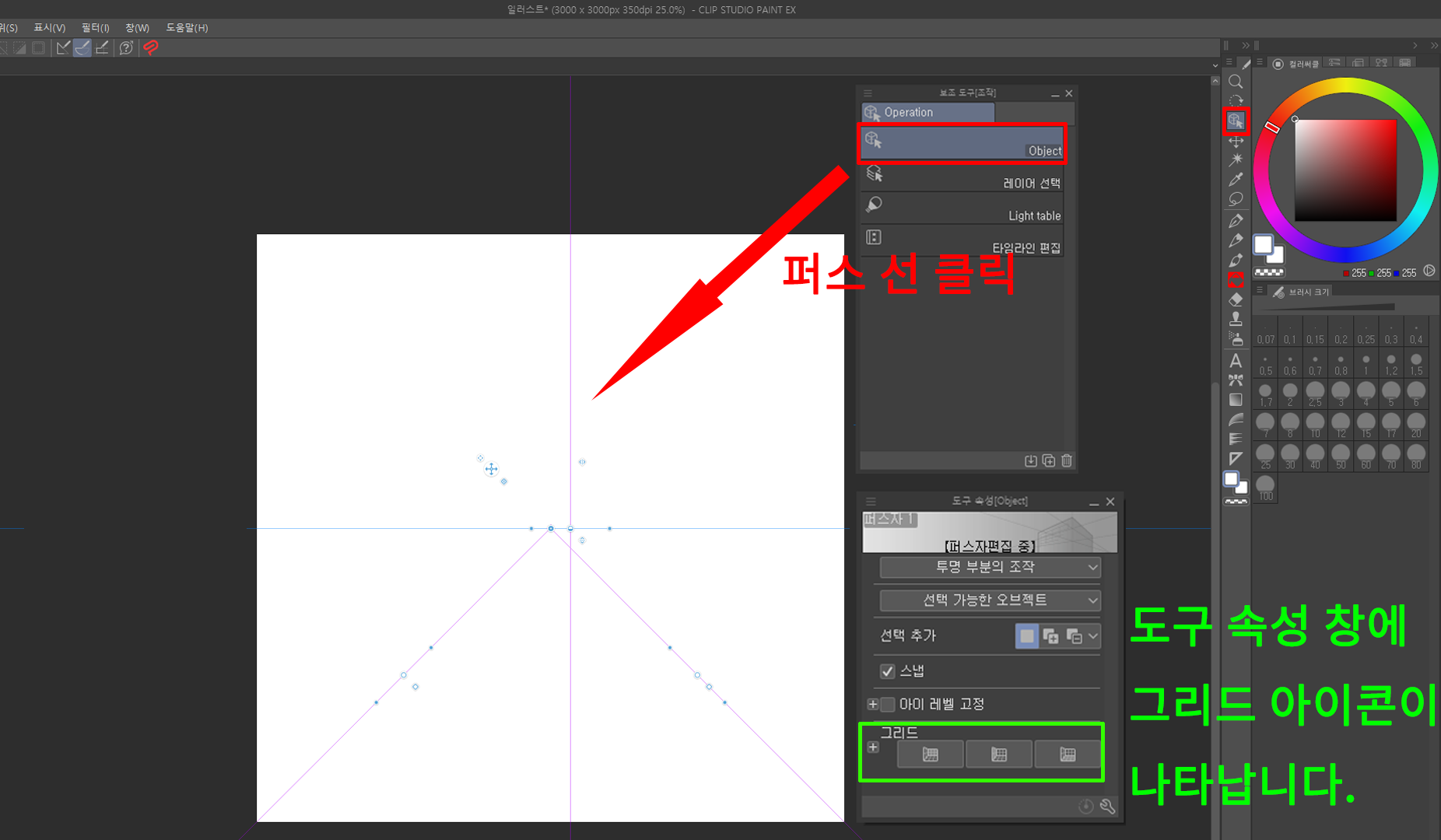 클립 스튜디오 상단, 메뉴 바의 [레이어 - 자/컷 테두리 - 퍼스 자 작성]을 클릭하고 '퍼스 자'를 작성한 후 '오브젝트 도구'로 '퍼스 선'을 클릭하게 되면 오브젝트 도구의 '도구 속성 창'에 그리드 아이콘들이 나오게 됩니다.
