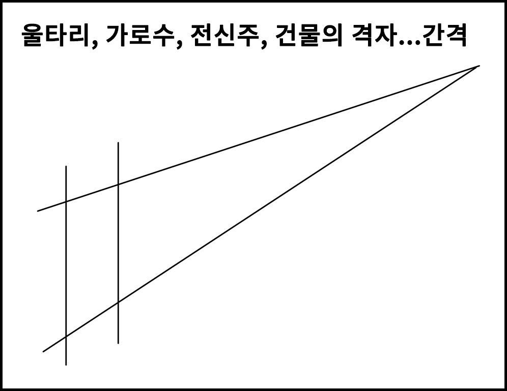◈ 소실점으로 이어지는 전신주나 울타리, 가로수, 건물의 격자 등등 간격 잡기.