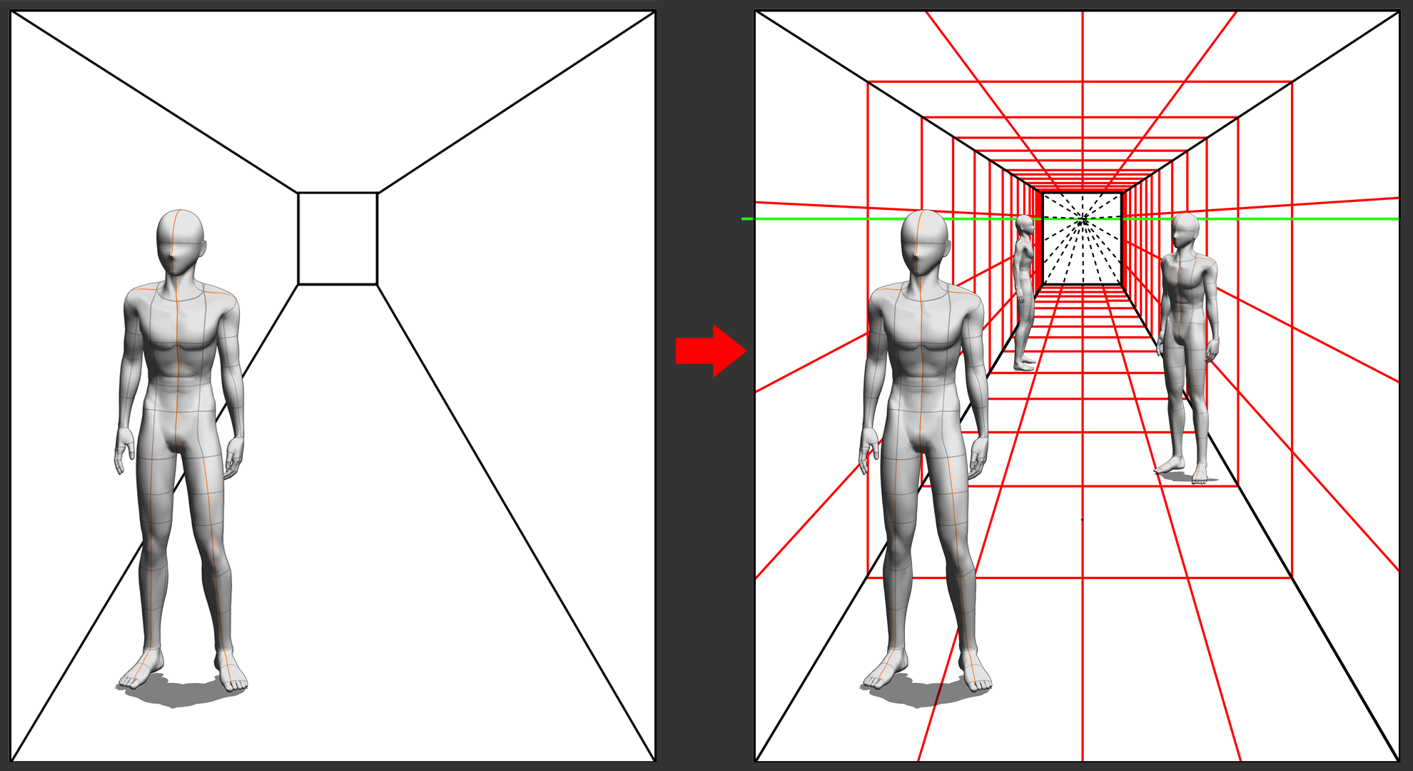 간단한 사용 예로, 아래의 왼쪽 그림과 같이 복도에 사람이 있고, 그 사람이 복도의 다른 곳에 있을 경우 어떻게 그려야 할지 비율이 애매하지만, 아래의 오른쪽 그림과 같이 그리드를 사용하게 되면, 예의 사람이 복도의 어느 곳에 있더라도 정확한 비율과 원근으로 그릴 수 있게 됩니다.