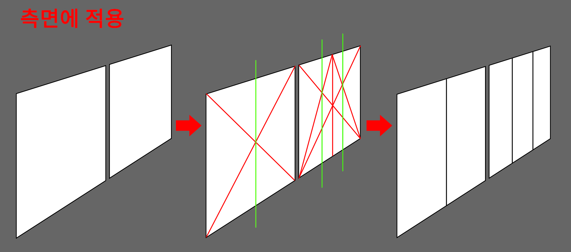 (측면의 벽도 X자를 그려서 중심을 찾고 그 중심과 소실점을 연결해서 2등분으로 나누었습니다.)