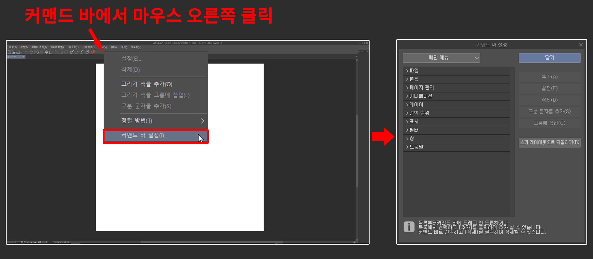2. 커맨드 바에서 마우스 오른쪽을 클릭하고 커맨드 바 설정에 들어갑니다.
