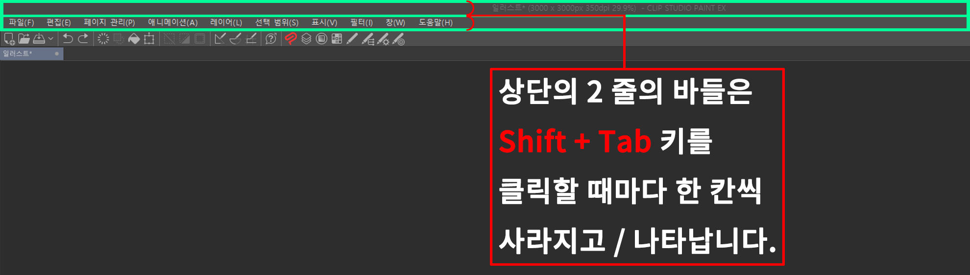 1. 우선 키보드의 Tab 키를 클릭하고 복잡한 기능 탭들을 숨깁니다.