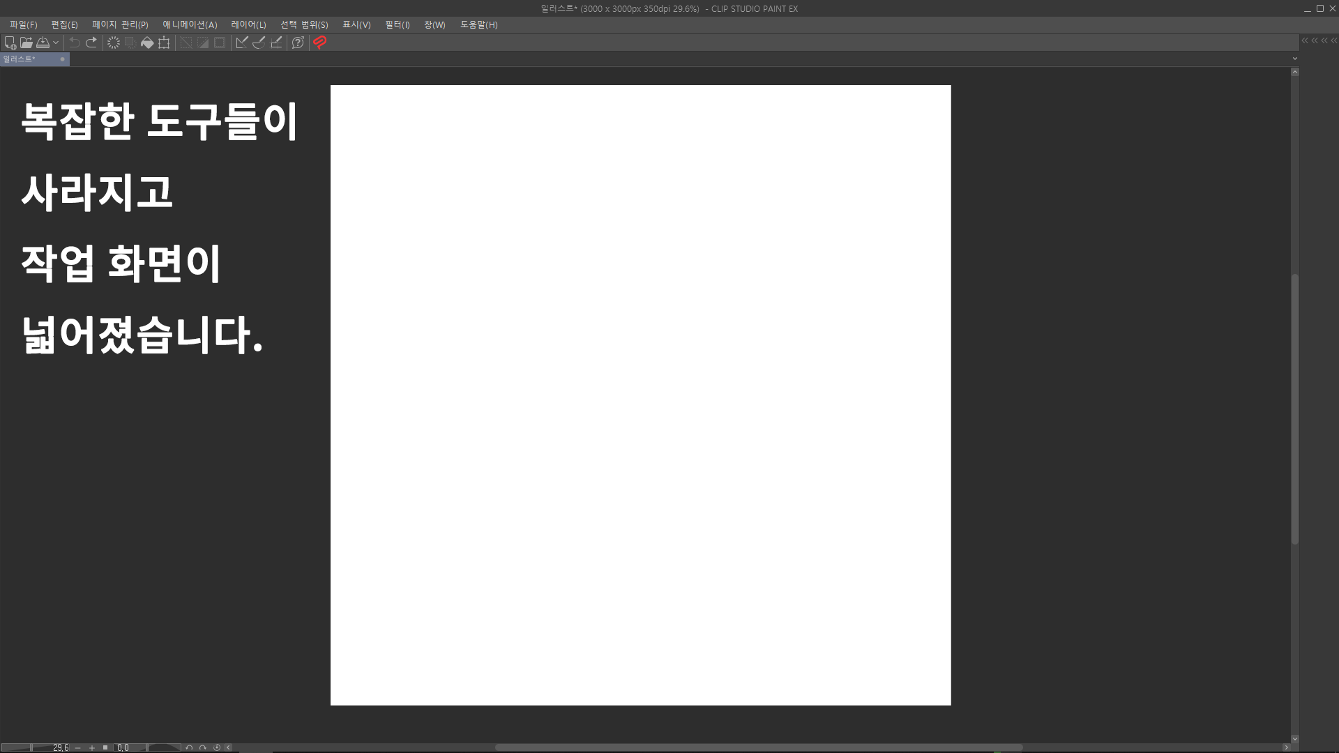 그리고 조금 더 화면을 넓히기 위해서 위쪽에 있는 2줄의 라인들을 Shift + Tab 키를 두 번 클릭해서 한 칸씩 순차적으로 숨깁니다. (Shift + Tab 키를 두 번 클릭해서 평소에는 커맨드 바만 남기고 사용하다가, 가끔씩 메뉴바가 필요할 때만 Shift + Tab 키로 메뉴 바를 꺼내서 쓰는 것이 좋을 것 같습니다.)